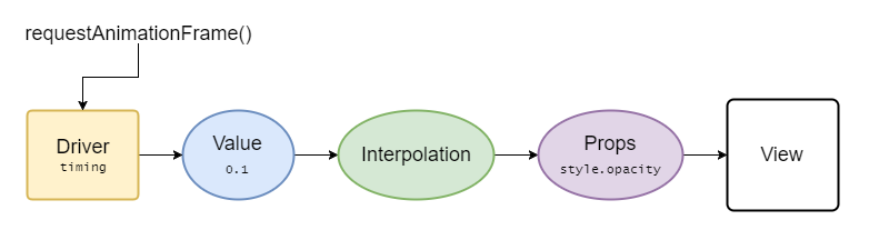 • JS: The animation driver uses requestAnimationFrame to execute on every frame and update the value it drives using the new value it calculates based on the animation curve.