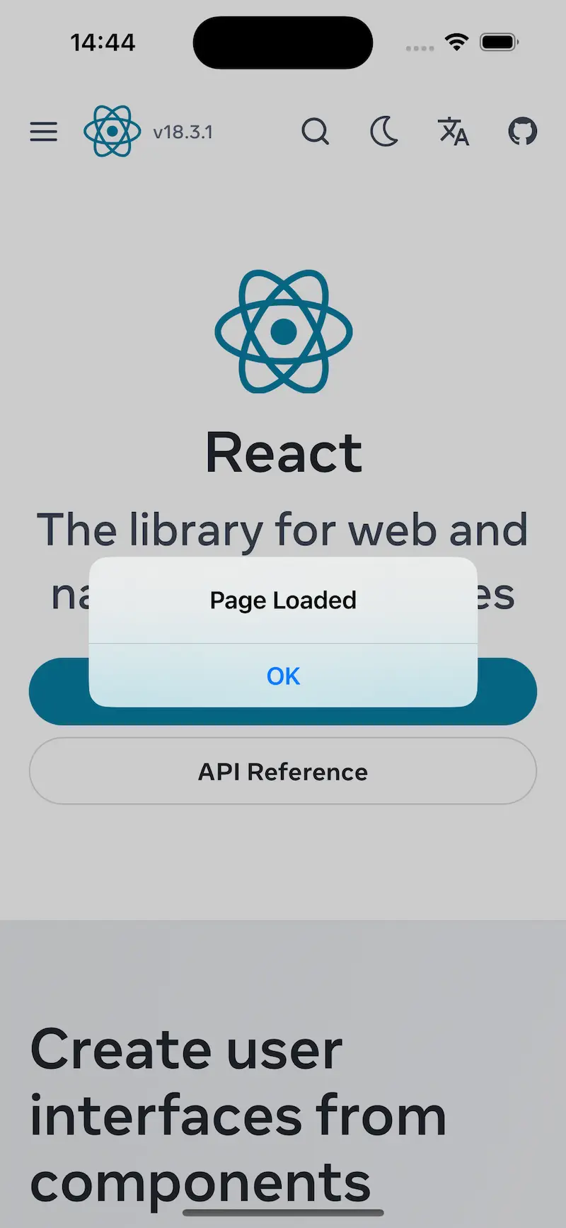 This code creates an app that uses the new WebView component we created to load the react.dev website.